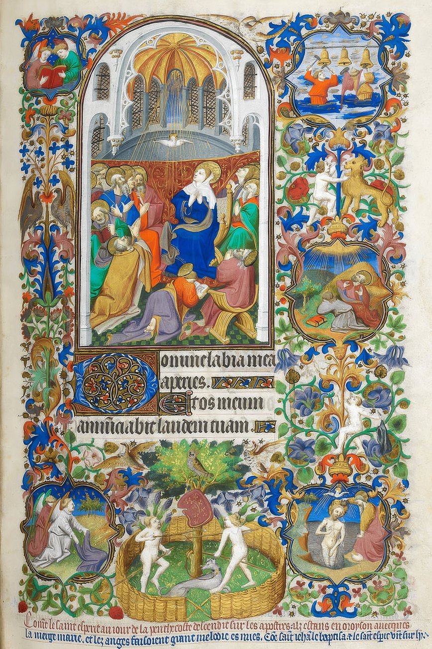 Manche Maler haben die Worte von Lukas ganz wörtlich genommen und zeigen zungenförmige Flammen, die eine Verbindung zwischen den feurigen Strahlen am Himmel und den Köpfen der Apostel erzeugen. Andere wie der Bedford-Meister verbildlichen die göttliche Präsenz durch die Taube als Symbol des Heiligen Geistes, wie sie schon im Lukas-Evangelium bei der Taufe Jesu beschrieben wird. Die Wirkung auf die Anhänger Jesu, die sich um Maria gruppieren, aber ist immer überwältigend. Ergriffen drängen sie sich in der Darstellung des Stundenbuchs aneinander, einige wenden das Gesicht erschrocken ab. Es ist der Beginn des Wunders der Verständigung, denn auf einmal – so berichtet Lukas weiter – hörte jeder der herbeigeeilten Menschenmenge, Juden aus allen möglichen Landesteilen, viele aus der Diaspora, darunter Ägypter, Römer, Kreter oder Araber, die Jünger in seiner Muttersprache reden. Durch den Heiligen Geist finden sie zu einer gemeinsamen Botschaft, die sie fortan in ihren Predigten, Briefen und den Texten des Neuen Testaments verkünden. Die Erzählung vom Pfingstereignis wird so zur Anti-Geschichte des Turmbaus zu Babel, zu einem Wunder Grenzen überschreitenden Verstehens und zum Beginn der christlichen Kirche.
