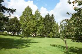 Ein 29 000 m² großer Park mit artenreichem Baumbestand, Sträuchern und begleitenden Beeten. Vor dem Haupteingang ein buntes Stauden-Rondell mit Formschnitt und Ziergehölzen.