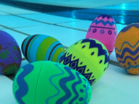 Je nach Alter und Schwimmlevel des Kindes sind Ostereier im Schwimmbad versteckt oder müssen durch Tauchen gehoben werden.