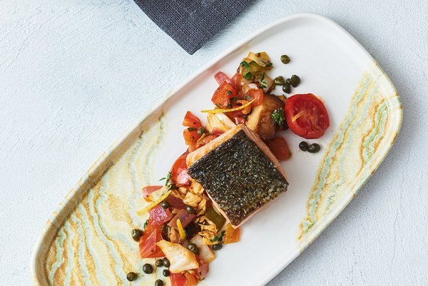 Lachsfilet aus dem Ofen mit Tomaten, Kapern, Zitrone und Röstgemüse