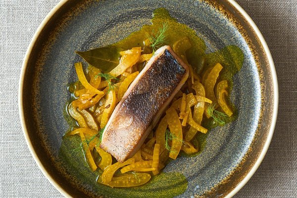 Das Bild ist gold-grau gehalten. In der Mitte einer tiefen runden brauen-grauen Tellers ist gelber Fenchelsalat angerichtet. Darauf liegt ein längliches Stück gebratener Fisch.