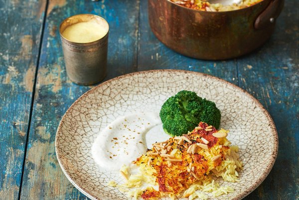 Chicken Biryani mit Mandeln, Brokkoli und Gewürz-Joghurt
