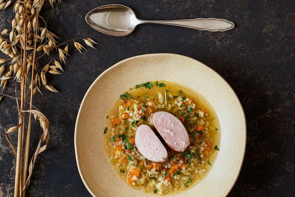 Schweinefilet im Kräutersud mit Graupen und Wurzelgemüse