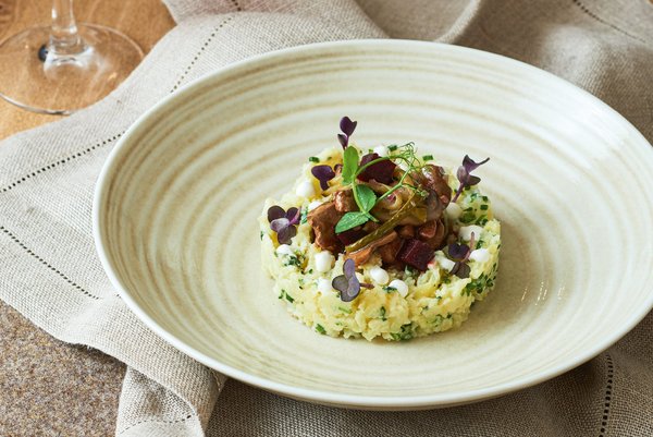 in Kapernsoße, geschmorte Rote Bete und Kräuterkartoffeln