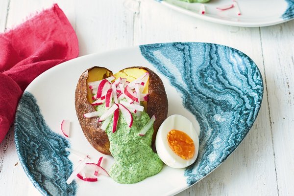 Backkartoffel mit grüner Soße, Ei und Radieschen