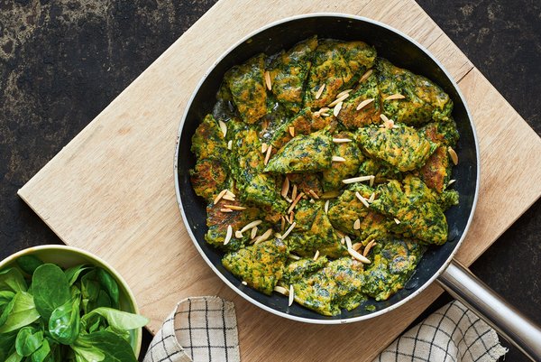 Eigelb mit Milch verrühren. Vollkornmehl, eine Prise Salz, Pfeffer und frisch geriebene Muskatnuss unterrühren. Das lauwarme Süßkartoffelpüree und den gehackten Spinat unterziehen, bis eine homogene Masse entsteht. Eiweiß mit einer Prise Salz steif schlagen. Den Schnee behutsam unter die Teigmasse heben, sodass sie locker und luftig bleibt.