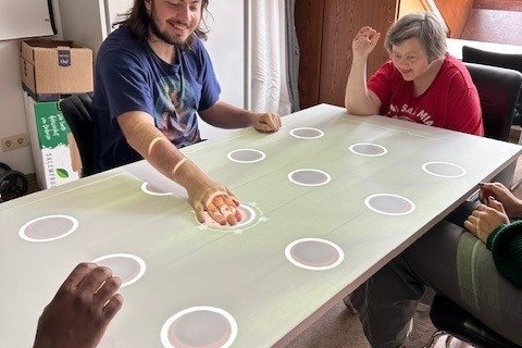 Bunte interaktive Seifenblasen auf dem Tisch platzen zu lassen oder beim Laubfegen auf dem Boden Freude zu erleben: Die sogenannte Tovertafel, frei aus dem Niederländischen übersetzt: ein Zaubertisch, bietet solche digitalen Aktivierungsmöglichkeiten für unsere Klient*innen im Förderbereich, der Seniorentagesstätte und den Werkstätten. Sie regt kognitive Fähigkeiten wie Konzentration, sprachliche Artikulierung und Gedächtnistraining an. Das gemeinsame Spielen steht hierbei im Vordergrund.